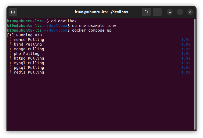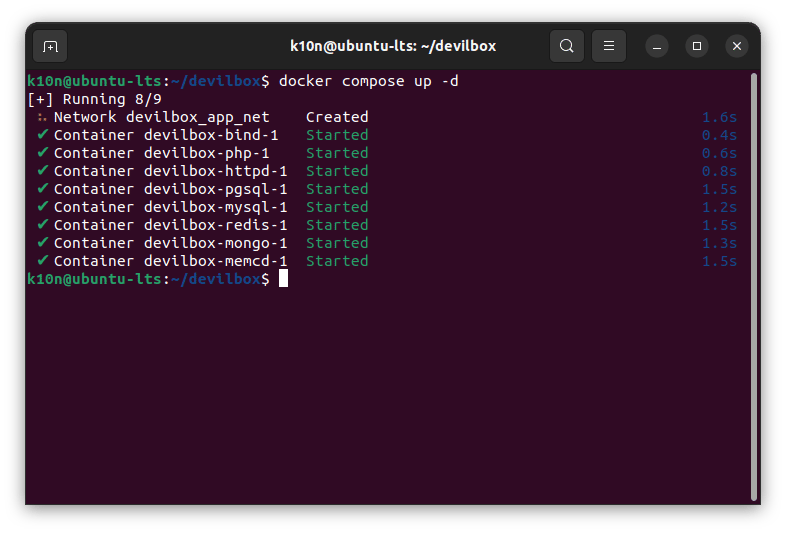 Lúc này, cơ bản phần chuẩn bị đã xong. Để khởi động Devilbox, hãy thực hiện câu lệnh sau: