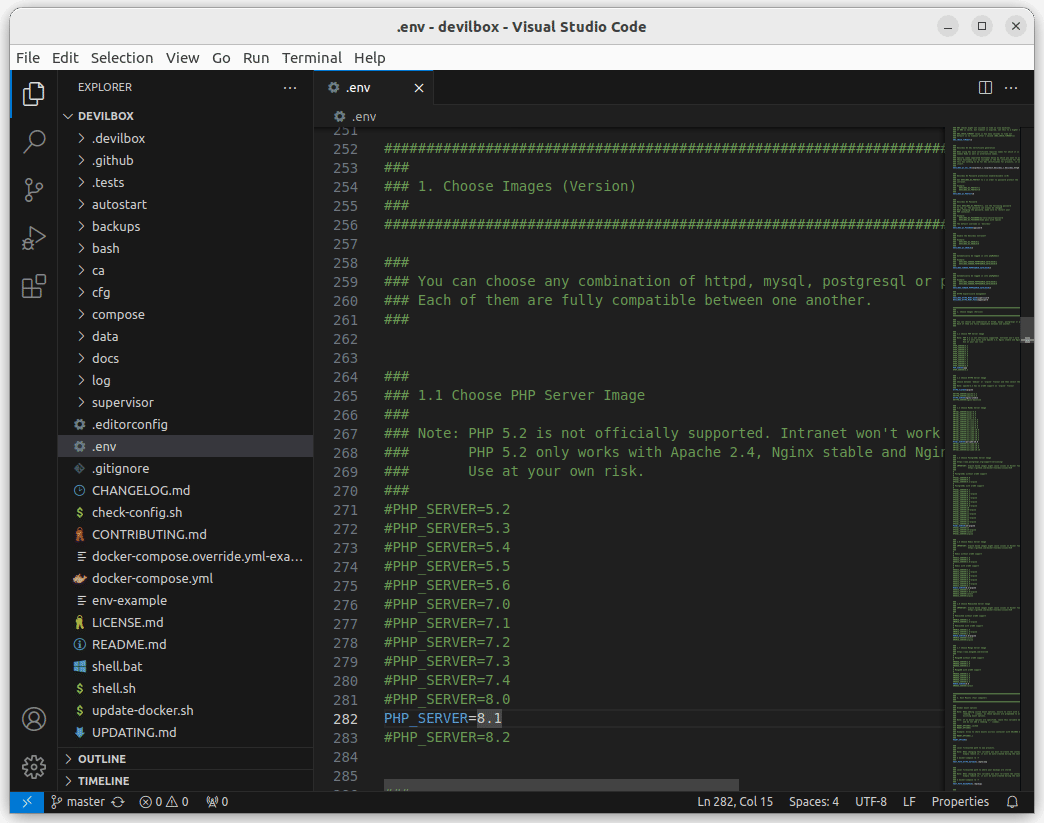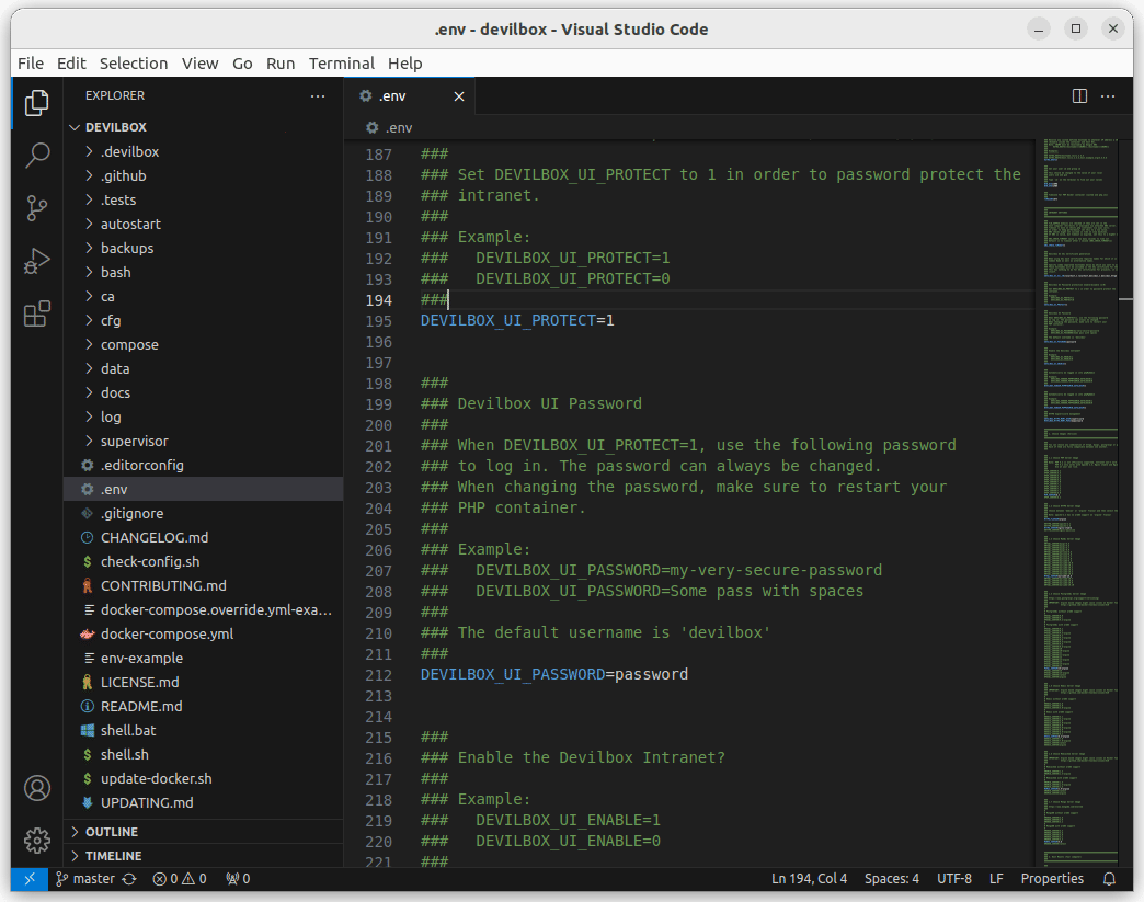 .envTập tin .env là tập tin chứa toàn bộ thông tin về các biến môi trường bên trong ứng dụng Devilbox dưới dạng các cặp khoá KEY=VALUE. Tập tin này cho phép chúng ta đơn giản hóa việc việc cấu hình Devilbox như là tùy chỉnh phiên bản PHP, hay cấu hình tài khoản root cho MySQL. Thậm chí là thêm biến môi trường môi trường cho ứng dụng PHP của mình, và còn rất rất nhiều thứ khác nữa.