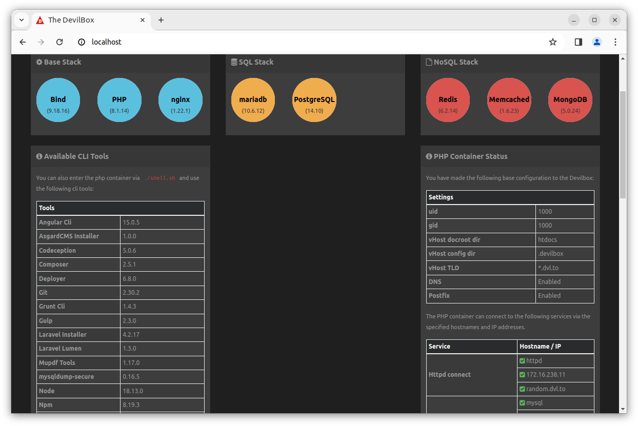 Đầu tiên là trang chủ, đây là nơi hiển thị toàn bộ thông tin cấu hình của Devilbox cũng như kiểm tra mọi thứ đã hoạt động đúng như kỳ vọng. Bạn có thể nhìn vào mục Available CLI Tools để thấy sự đồ sộ của Devilbox khi đã tích hợp rất nhiều công cụ dòng lệnh.