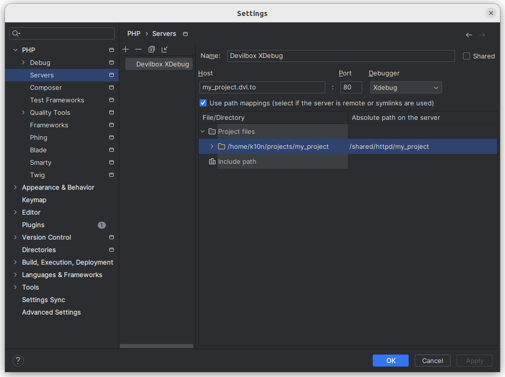 Các bạn có thể thấy phần path mapping cũng cấu hình tương tự như VS Code. Chúng ta sẽ ánh xạ đường dẫn thư mục dự án tương ứng với đường dẫn trong PHP Container.