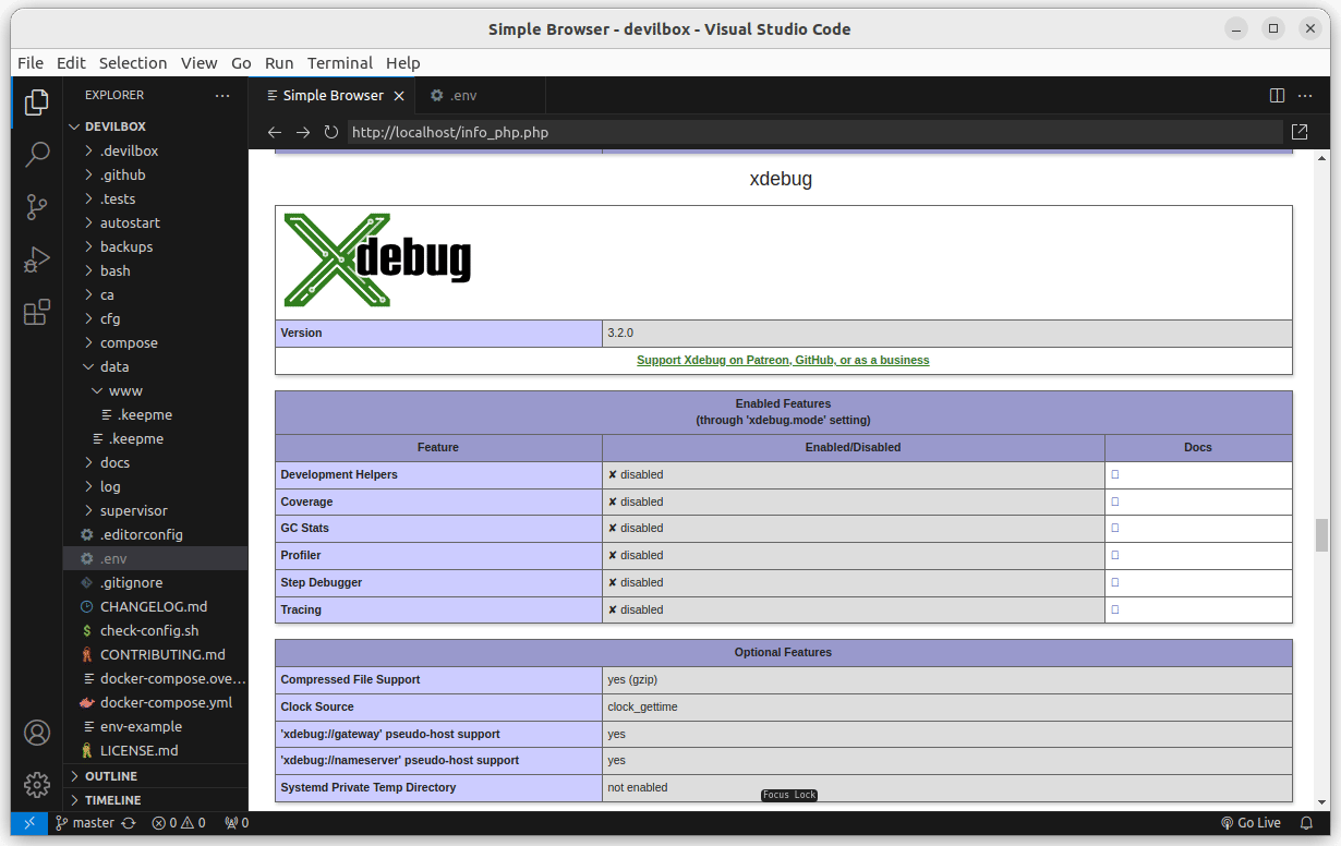 Sau đó, hãy khởi động lại Devilbox và kiểm tra lại mục xdebug đã nhận cấu hình mới hay chưa?