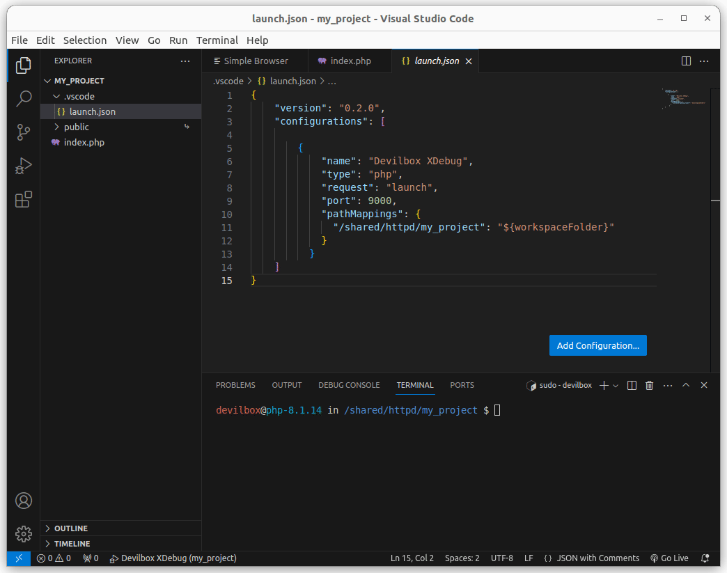 Như các bạn thấy, chúng ta đang ánh xạ thư mục dự án hiện tại với thư mục dự án bên trong PHP container và sử dụng port 9000 của Xdebug.
