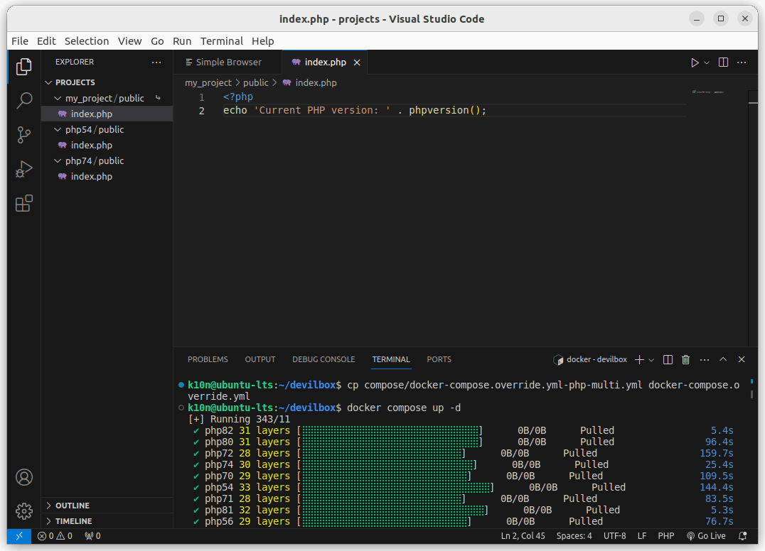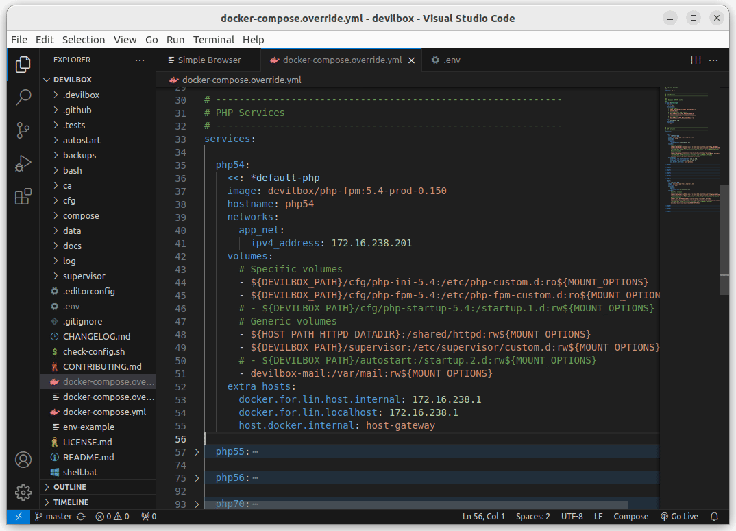 docker compose downdocker-compose.override.yml-php-multi.yml trong thư mục compose ra thư mục chính và đổi tên thành docker-compose.override.yml.cp compose/docker-compose.override.yml-php-multi.yml docker-compose.override.ymlLúc này, tại thư mục chính sẽ có hai tập tin docker-compose tương tự như sau: