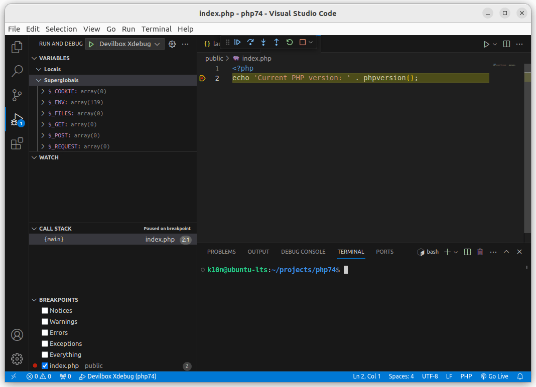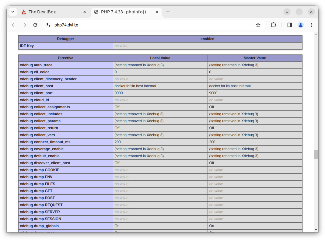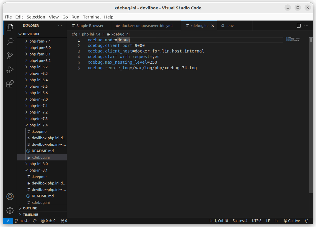Cấu hình Xdebug với Devilbox đã được tôi hướng dẫn chi tiết trước đó. Các bạn có thể tham khảo lại tại đây. Tuy nhiên, phần cấu hình đã đề cập chỉ có tác dụng với phiên bản PHP được cài đặt mặc định. Như trong ví dụ này là phiên bản 8.1. Để cho Xdebug trên hai dự án php54 và php74 cũng hoạt động bình thường. Bạn nên cấu hình thêm một chút như sau: