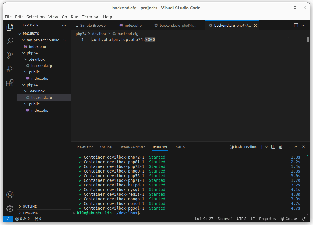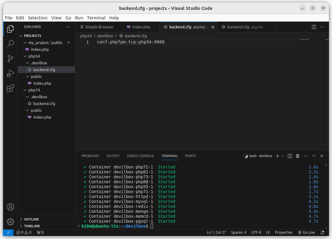 .devilbox. Bên trong thư mục này, tiếp tục tạo tập tin có tên là backend.cfg. Cấu trúc của thư mục lúc này sẽ như sau:├── projects