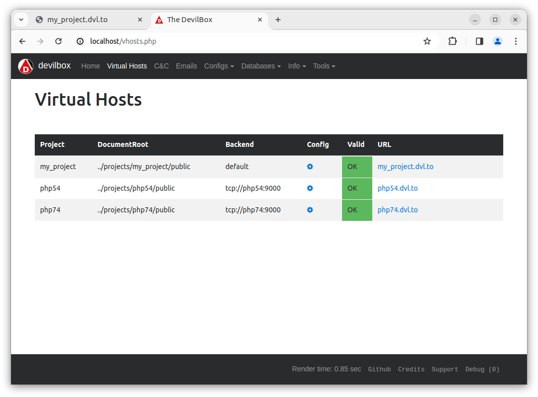 └── index.phpChúng ta sẽ tạo lần lượt ba dự án là my_project, php54 và php74 tương ứng với các tên miền như trên. Trong đó, my_project sẽ chạy phiên bản PHP mặc định khi khởi động là 8.1. Hai dự án còn lại sẽ tương tự như tên dự án lần lượt là 5.4 và 7.4.